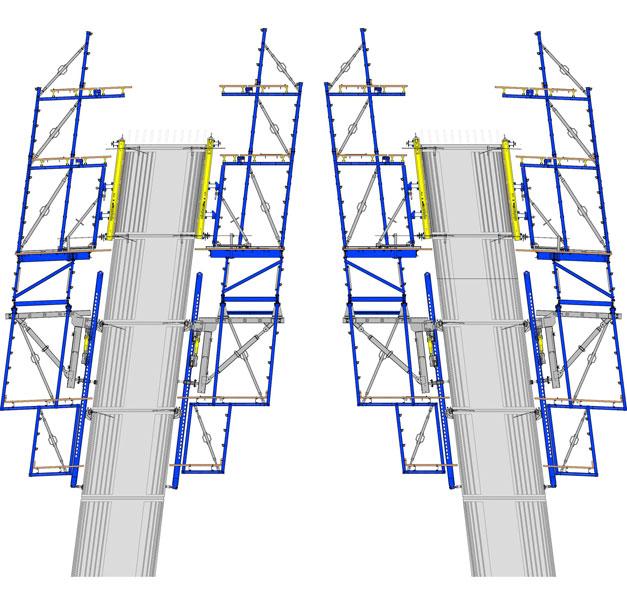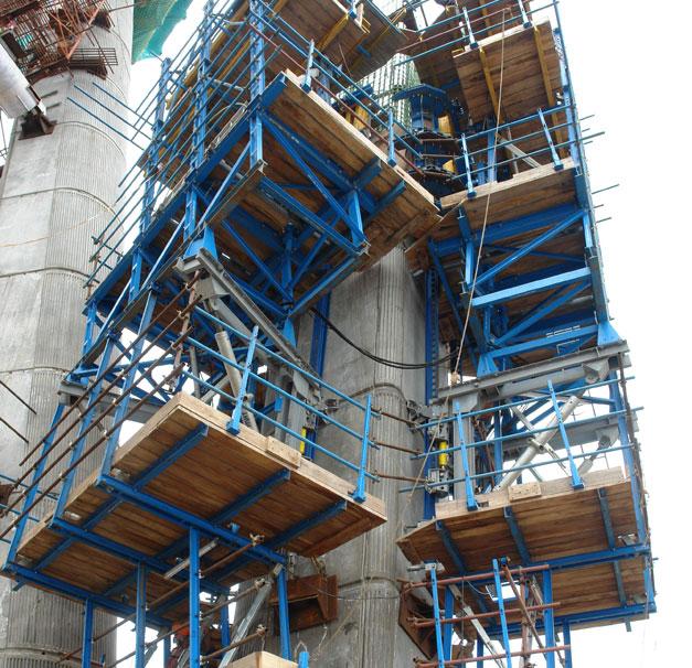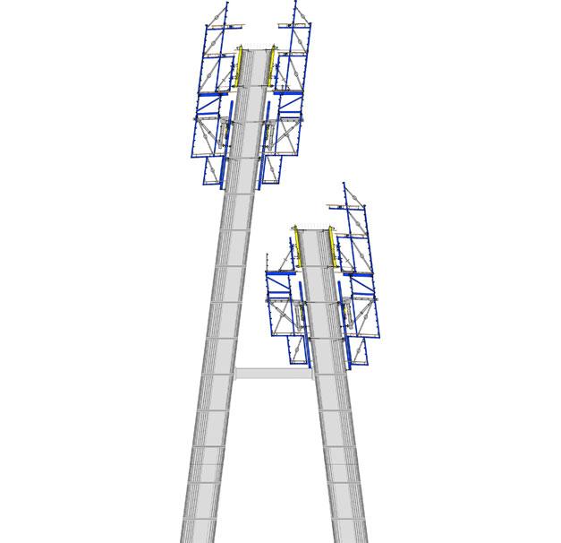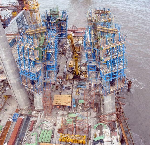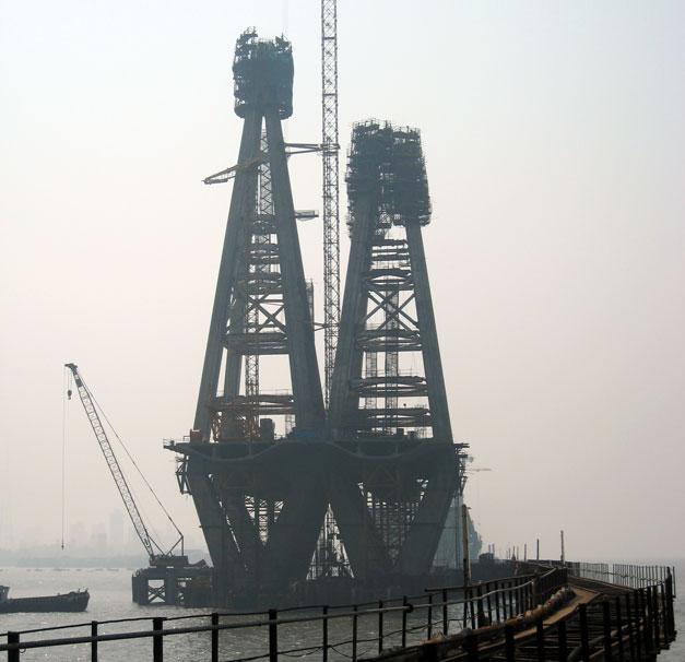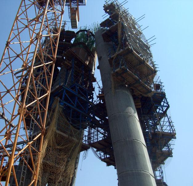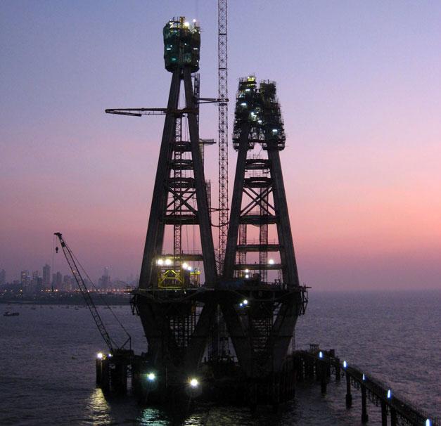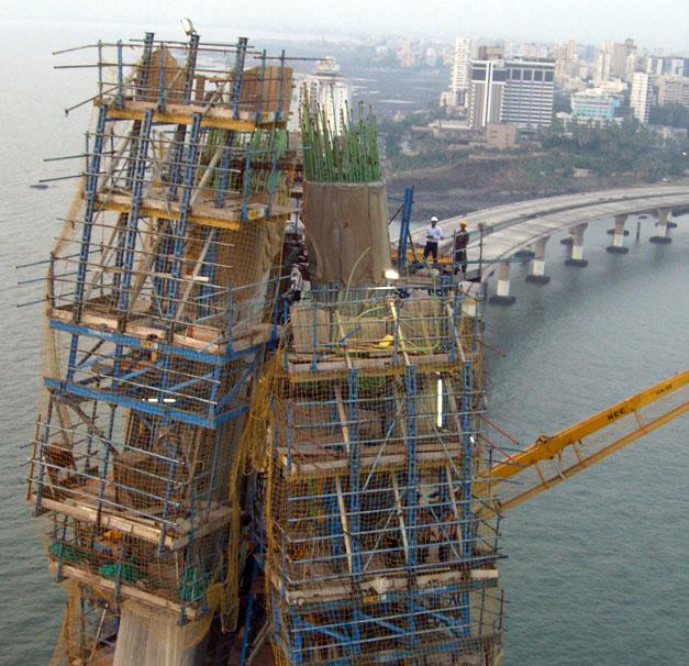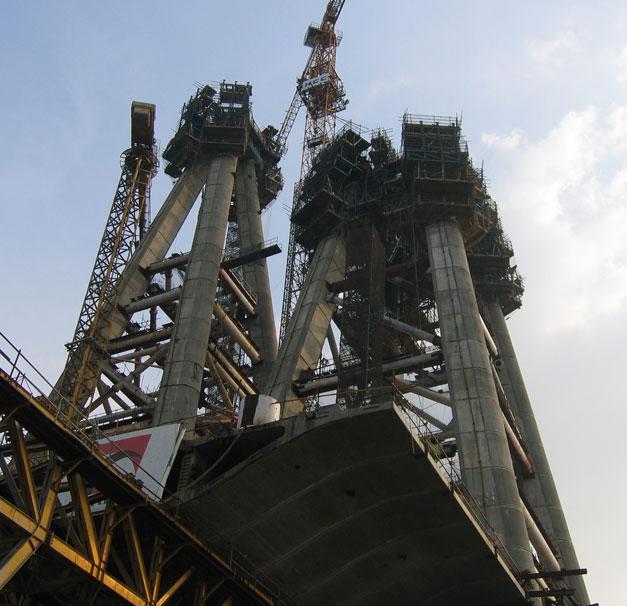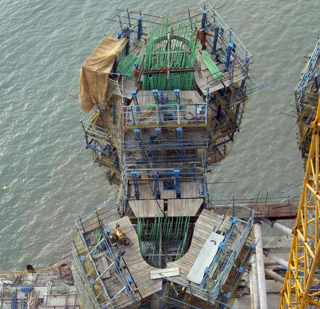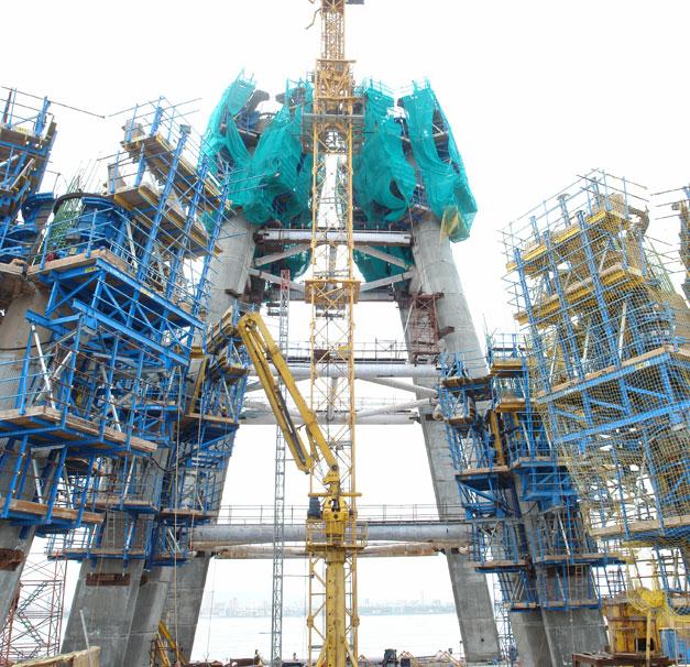 In Mumbai, Hindustan Construction Co. Ltd. erected an 8-lane coastline motorway bridge. The centrepieces of this structure are its two 128 m high pylons, each consisting of four legs. Owing to the complex fair-faced concrete requirements, Large-area formwork Top 50 was used here in conjunction with a steel formwork.