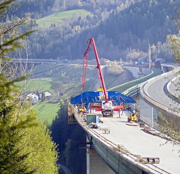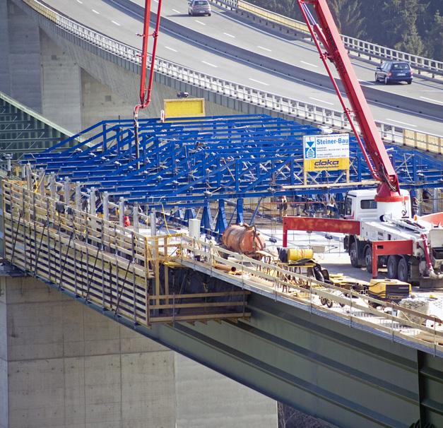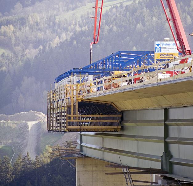 As part of the twin-carriageway upgrade to Austria's A2 Süd-Autobahn a second, 700m long bridge superstructure had to be constructed alongside the existing valley crossing P30 at a height of around 70m. It was built as a steel-composite superstructure, meaning that once the steel superstructure was in place, the CIP concrete deck slab was cast with the aid of a Doka composite forming carriage.
