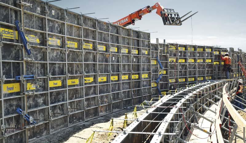 In order to accomplish this goal, Frami formwork panels were selected as the best solution for inside and outside wall forms. The system adapted to all steps, height changes, transitions and sloping conditions on the project. The Frami panels are lightweight and easy to handle, so they can be erected very quickly by hand. The Frami Corded Radius System was very efficient for the serpentine radius changes as it incorporated fillers for the gain of the outside panels. The Frami panels were united with Circular formwork H20 radius forms by standard profile adapters for clamp connections on the tighter radius scope.