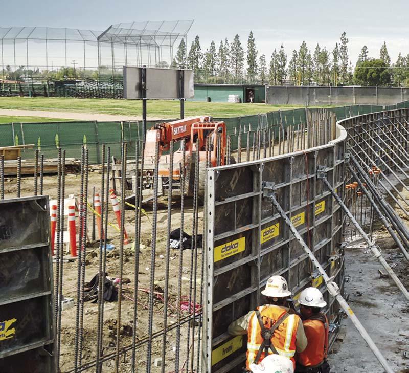 The Foothill High School Auxiliary Gymnasium serves as a location for sports practices and for many other events, including parent meetings and AP testing. Using traditional wood forms in the past, the challenge was to find a new formwork system to construct the north and south retaining walls, leading into radium walls with serpentine