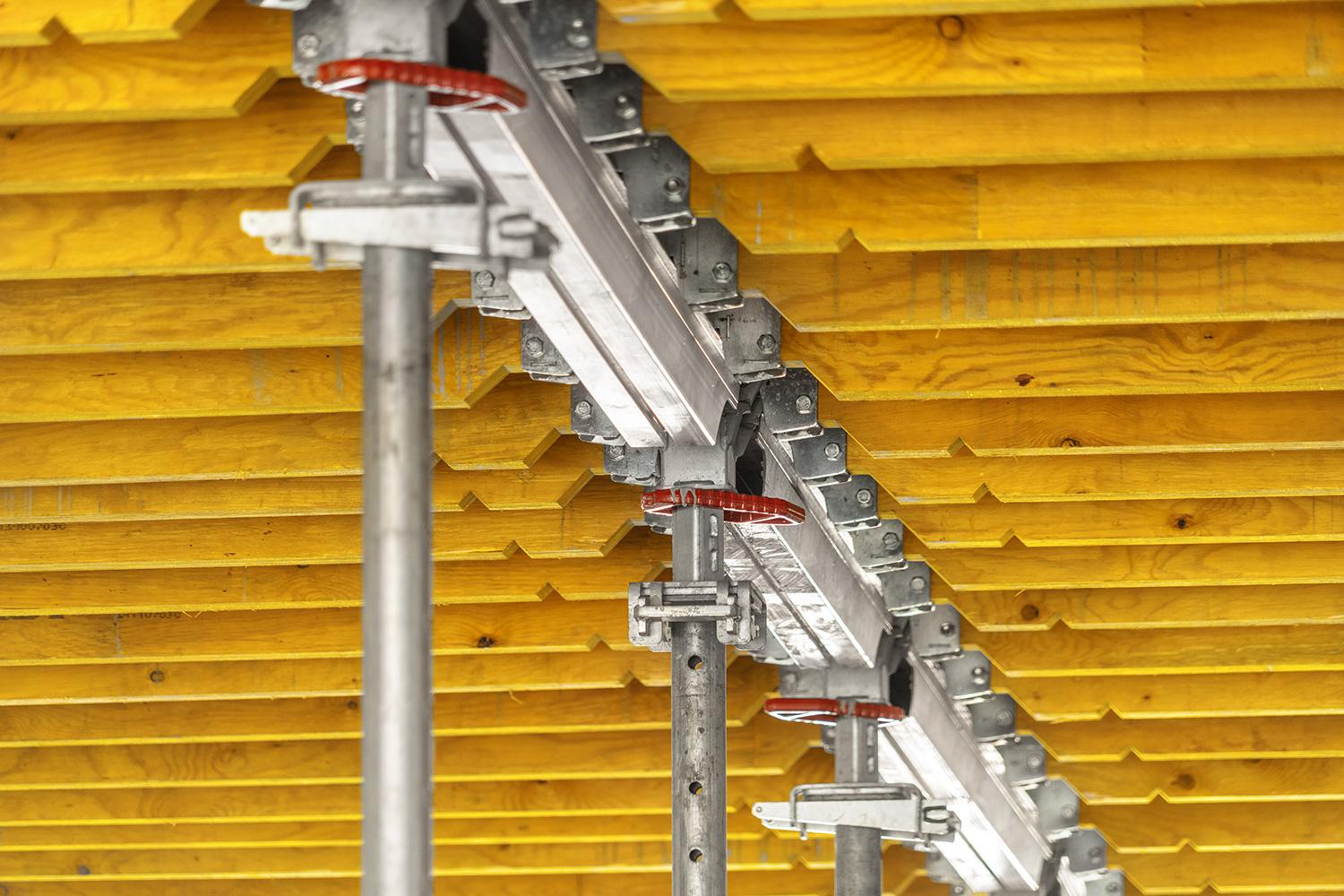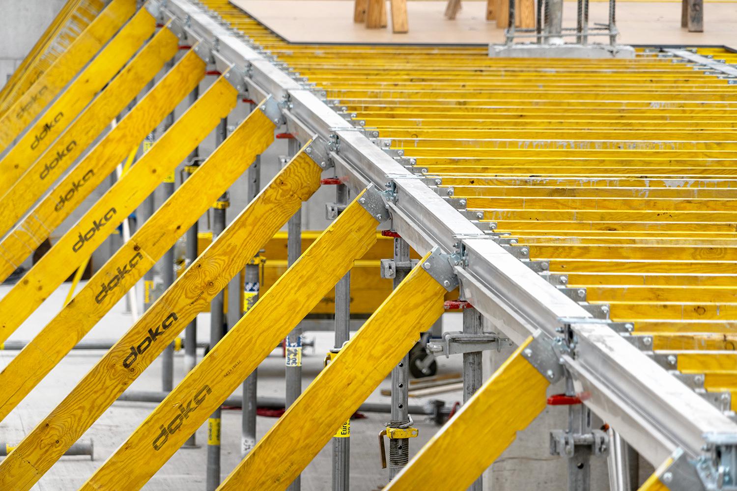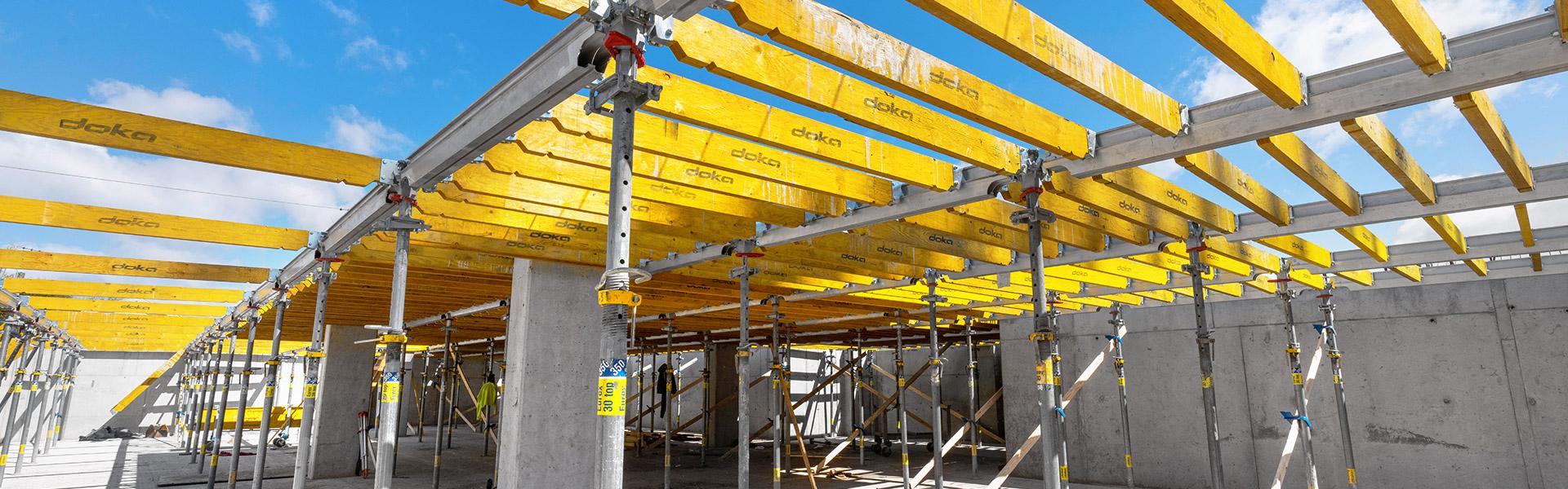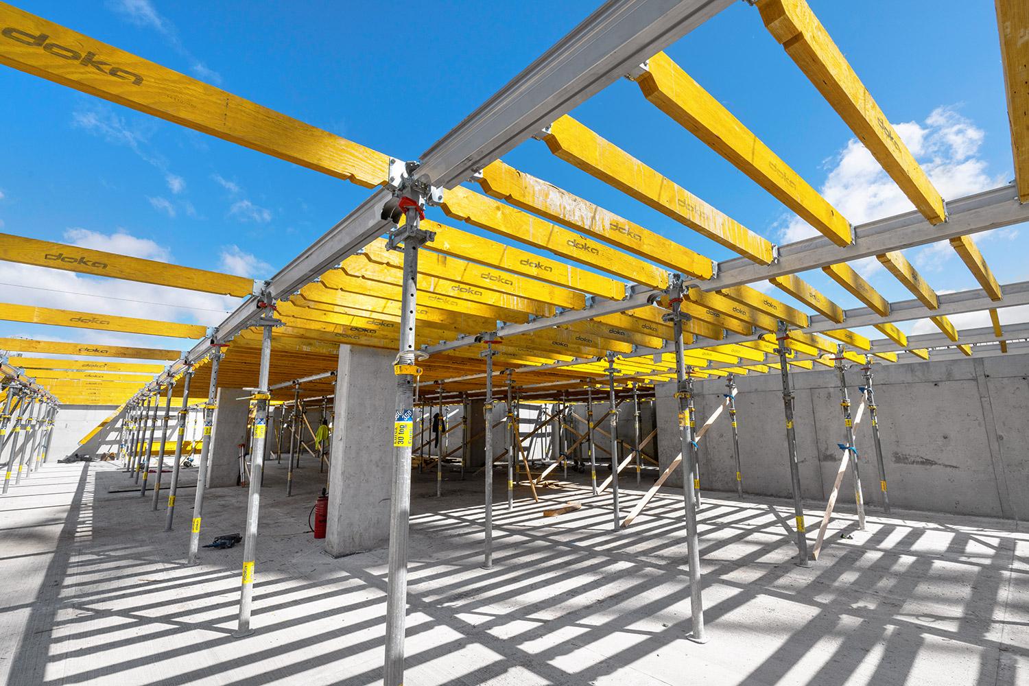 Building Concrete Solution’s formwork manager wanted to try out the new Superdek grid system from Doka. Superdek is a simple handset drop head slab formwork system with large grid / prop spacing ― up to 8x8-feet. With interlocking joists and stringers, and a unique slab edge forming solution, it provided increased productivity with less labor and maximum safety. There was a maximum flexibility in standard lengths, faster production with less material, and the Superdek drop head allowed for early removal of joists and stringers for faster cycling to the next area.