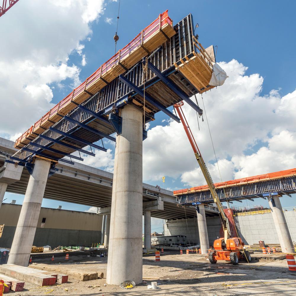 When the bridge became part of the Interstate Highway System, its daily traffic skyrocketed to unsustainable numbers, sometimes reaching up to 18 times its original planned capacity. The old truss bridge was eventually demolished in 2017, after Phase I of its replacement – one of two cable-stayed bridges, the first of their kind in New York City – was completed ahead of schedule in April of that year. Phase II of this project involves the construction of a second cable-stayed bridge for westbound traffic. The first bridge, which currently serves both east- and westbound traffic, will become eastbound-only upon completion of the second bridge. Doka was brought onto both phases of the Kosciuszko Bridge project due to past successes with the general contractor and our ability to provide material for all aspects and areas of the project. In Phase II, Doka has provided multiple solutions, including Frami, steel column forms, girder panels, Framax, Staxo and 100k/200k shoring towers. Crews used Doka’s 300k brackets/spreader beams, Staxo shoring, 100k shoring and 200k shoring to form various pier caps. Steel cover plates were then used on the top and bottom of the sides of the girder panels on the pier caps to reinforce their strength as they spanned from one column to the next. Together, the two bridges will improve traffic safety, reduce congestion and improve travel speeds thanks to the design of wider driving lanes and shoulder widths, auxiliary lanes in both directions, and a reduced incline that allows trucks to more easily maintain a consistent speed when crossing. These improvements are projected to reduce delays by more than 65 percent during peak hours.