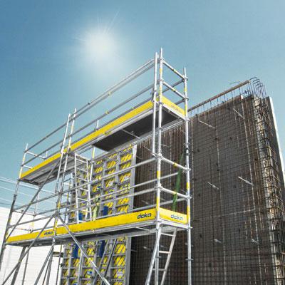 Doka safety systems facilitate every single stage of the project. Safety is 'planned in' right from the outset, co-ordinated with the formwork technology systems used, and designed to boost productivity and quality. The working platforms used in pouring include side railings and opposing guard-rails. On tall wall formwork units, intermediate platforms with side railings are a safe and efficient solution. Safe vertical access to the pouring-platform level is particularly important on column formwork. Doka meets these requirements with practical safety solutions.